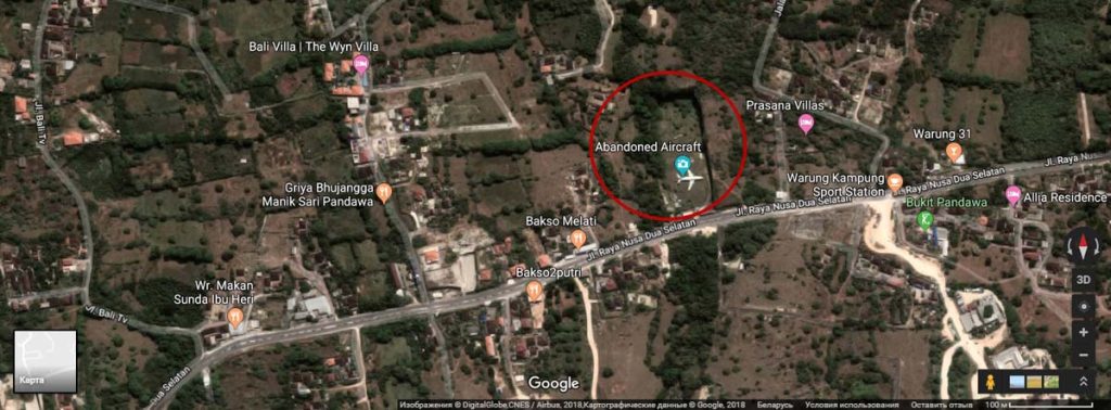 Самолёт расположен в южной оконечности Бали, на полуострове Букит. Если отправитесь к нему, включите также в свой маршрут посещение пляжей Пандава и Меласти (находятся они недалеко от заброшенного самолёта). И конечно же храма Улувату, который чуть дальше, но всё равно в тех же краях.